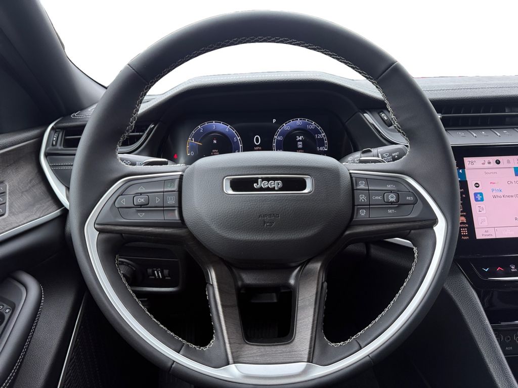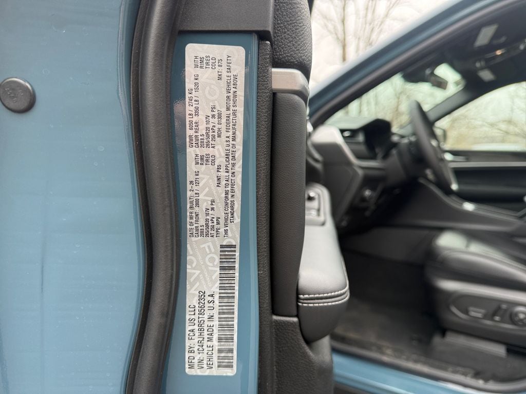 Limited Altitude Package (Delete Limited Badge, Dual-Pane Panoramic Sunroof, Exterior Accents Dark Neutral Metallic, and Wheels: 20" x 8.5" Gloss Black Painted Aluminum), Quick Order Package 2BE Limited, 4WD, 10 Speakers, 3.70 Rear Axle Ratio, 4-Wheel Disc Brakes, 4G LTE Wi-Fi Hot Spot, ABS brakes, Active Noise Control System, Air Conditioning, Alloy wheels, AM/FM radio: SiriusXM with 360L, Anti-whiplash front head restraints, Apple CarPlay, AppLink/Apple CarPlay and Android Auto, Audio memory, Auto High-beam Headlights, Automatic temperature control, Auxiliary Battery, Brake assist, Bumpers: body-color, Capri Leatherette Seats, Compass, Connectivity - US/Canada, Delay-off headlights, Disassociated Touchscreen Display, Driver door bin, Driver vanity mirror, Dual front impact airbags, Dual front side impact airbags, Electronic Stability Control, Emergency communication system, For Details, Visit DriveUconnect.com, Four wheel independent suspension, Front anti-roll bar, Front Bucket Seats, Front Center Armrest w/Storage, Front dual zone A/C, Front fog lights, Front License Plate Bracket, Front reading lights, Fully automatic headlights, Garage door transmitter, Global Telematics Box Module (TBM), Gloss Black Exterior Mirrors, Google Android Auto, GPS Antenna Input, Heated door mirrors, Heated Exterior Mirrors, Heated front seats, Heated rear seats, Heated steering wheel, Illuminated entry, Integrated Center Stack Radio, Integrated Voice Command with Bluetooth, Knee airbag, Low tire pressure warning, Manual Folding Exterior Mirrors, Memory seat, MyFlexCare Service Plan, Navigation System, Normal Duty Suspension, Occupant sensing airbag, Outside temperature display, Overhead airbag, Overhead console, Panic alarm, ParkView Rear Back-Up Camera, Passenger door bin, Passenger vanity mirror, Power door mirrors, Power driver seat, Power Liftgate, Power passenger seat, Power steering, Power windows, Radio data system, Radio: Uconnect 5 Nav with 12.3" Display, Rear anti-roll bar, Rear reading lights, Rear window defroster, Rear window wiper, Remote keyless entry, Security system, Speed control, Speed-Sensitive Wipers, Split folding rear seat, Spoiler, Steering wheel mounted audio controls, Tachometer, Telescoping steering wheel, Tilt steering wheel, Traction control, Trip computer, Turn signal indicator mirrors, USB Host Flip, Variably intermittent wipers, Voltmeter, and Wheels: 18" x 8.0" Polished/Painted AluminuM.