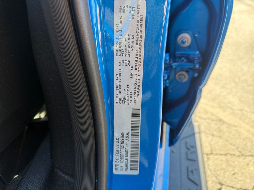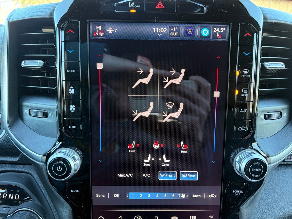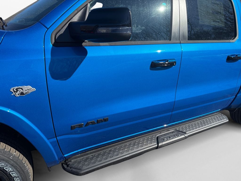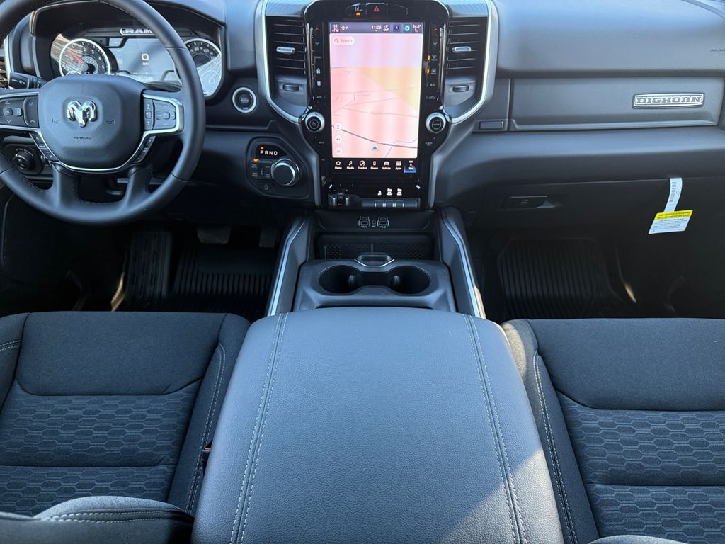 Bed Utility Group (Exterior 115V AC Outlet, MOPAR 4 Adjustable Cargo Tie-Down Hooks, MOPAR Spray in Bedliner, and Pick-Up Box Lighting), Big Horn Level 2 Equipment Group (115V Auxiliary Power Outlet, 115V Auxiliary Rear Power Outlet, 12" Touchscreen Display, 2nd Row in Floor Storage Bins, 3 Rear Seat Head Restraints, 4 Way Front Headrests, 400W Inverter, 4G LTE Wi-Fi Hot Spot, 9 Amplified Speakers with Subwoofer, Air Conditioning ATC with Dual Zone Control, Apple CarPlay, Auto Power-Folding Mirrors, Auto-Dimming Exterior Driver Mirror, Auto-Dimming Rear-View Mirror, Black Exterior Mirrors, Black Premium Power Mirrors, Body Color Fender Flares, Bucket Seats, Center Console Parts Module, Cluster 7.0" TFT Color Display, Configurable Drive Mode, Connected Travel and Traffic Services, Connectivity - US/Canada, Convex Wide-Angle Exterior Mirror Insert, Deluxe Cloth Bucket Seats, Disassociated Touchscreen Display, Exterior Mirrors Courtesy Lamps, Exterior Mirrors with Heating Element, Exterior Mirrors with Supplemental Signals, Front Seat Back Map Pockets, Full Length Floor Console, Global Telematics Box Module, Glove Box Lamp, Google Android Auto, GPS Antenna Input, GPS Navigation, HD Radio, Heated Front Seats, Heated Steering Wheel, Integrated Center Stack Radio, Integrated Voice Command with Bluetooth, Leather Wrapped Steering Wheel, LED Dome Lamp with on/Off Switch, LED Footwell Lighting, Manual Adjust 4-Way Front Passenger Seat, Media Hub with 2 Charge Only USBs, Overhead LED Lamps, Power 2-Way Driver Lumbar Adjust, Power Adjust 8-Way Driver Seat, Power Adjustable Pedals, Premium Overhead Console, Radio: Uconnect 5 Navigation with 12.0" Display, Rear 60/40 Folding Seat, Rear Center Armrest, Rear Power Sliding Window, Rear Window Defroster, Remote Tailgate Release, Security Alarm, SiriusXM Radio Service, SiriusXM with 360L, Steering Wheel Mounted Audio Controls, Sun Visors with Illuminated Vanity Mirrors, Universal Garage Door Opener, and USB Host Flip), Night Edition (Accent Color Door Handles, Accent Color Premium Power Mirrors, Accent Color Tailgate Handle, Anti-Spin Differential Rear Axle, Black Exterior Truck Badging, Black Headlamp Bezels, Black Interior Accents, Black Painted Exterior Mirrors Caps, Black Tail Lamp Bezels, Body Color Front Bumper, Body Color Rear Bumper with Step Pads, Dual Exhaust with Black Tips, Grille Black Surround Black Mesh, RAM Grille Badge - Black, and Wheels: 20" x 9.0" Aluminum Painted Clad), Quick Order Package 27Z Big Horn, 4-Wheel Disc Brakes, 48V Belt Starter Generator, 6 Speakers, ABS brakes, Air Conditioning, Alloy wheels, AM/FM radio, Apple CarPlay/Android Auto, Auto High-beam Headlights, Brake assist, Bumpers: chrome, Cloth Bucket Seats, Compass, Delay-off headlights, Driver door bin, Dual front impact airbags, Dual front side impact airbags, Electronic Stability Control, Front anti-roll bar, Front Bucket Seats, Front Center Armrest w/Storage, Front fog lights, Front License Plate Bracket, Front reading lights, Front wheel independent suspension, Fully automatic headlights, Heated door mirrors, Illuminated entry, Low tire pressure warning, Manual Adjust 4-Way Driver Seat, Manual Folding Exterior Mirrors, Manufacturer's Statement of Origin, Mopar Black Tubular Side Steps, MOPAR Front and Rear Rubber Floor Mats, MyFlexCare Service Plan, Occupant sensing airbag, Outside temperature display, Overhead airbag, Overhead console, Panic alarm, ParkView Rear Back-Up Camera, Passenger door bin, Passenger vanity mirror, Power door mirrors, Power steering, Power windows, Radio data system, Radio: Uconnect 5 W with 8.4" Display, RAM Grille Badge - Chrome, Rear anti-roll bar, Rear step bumper, Rear Wheelhouse Liners, Remote keyless entry, Speed control, Supplier Part Tracking (J-1), Tachometer, Telescoping steering wheel, Tilt steering wheel, Traction control, Trailer Brake